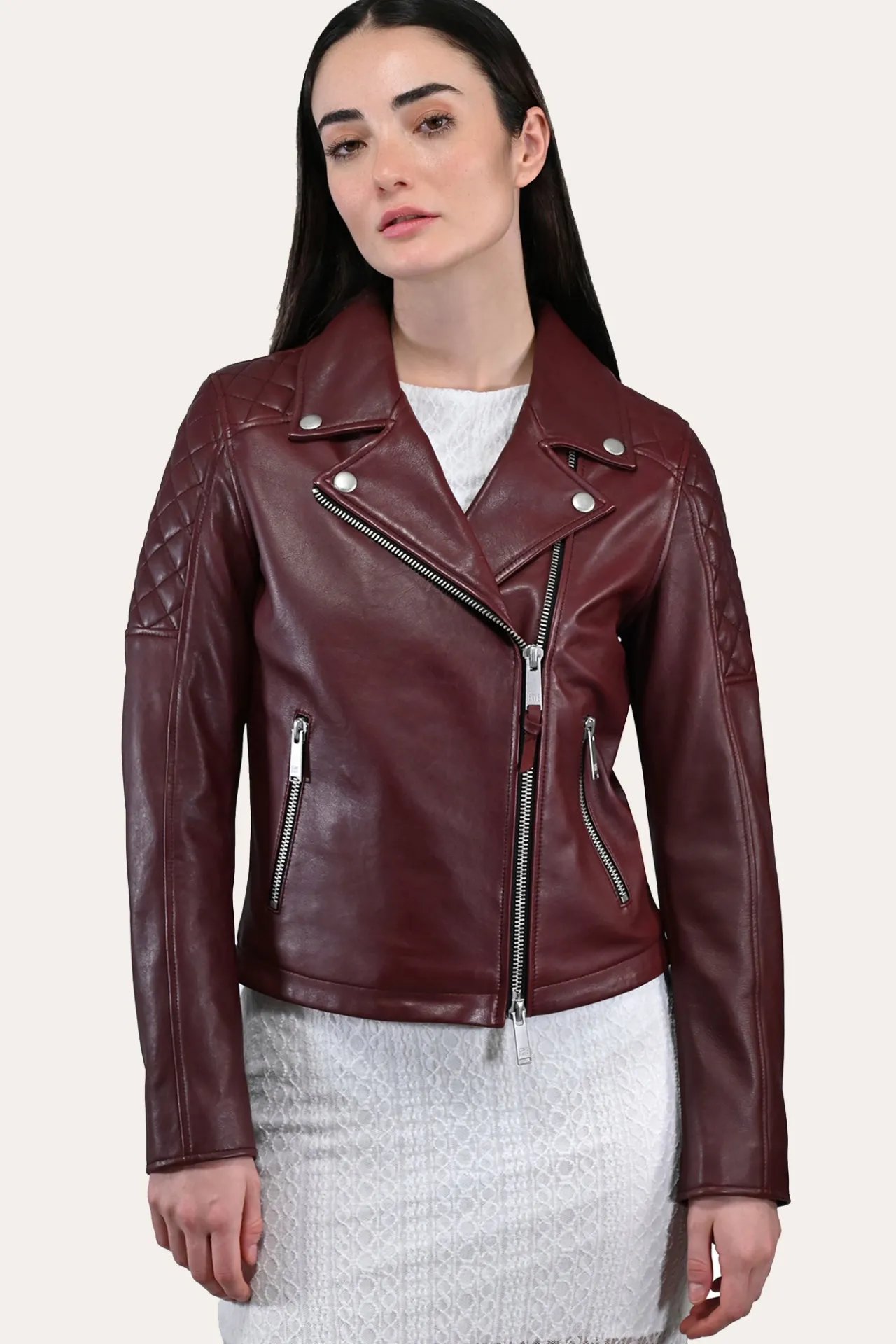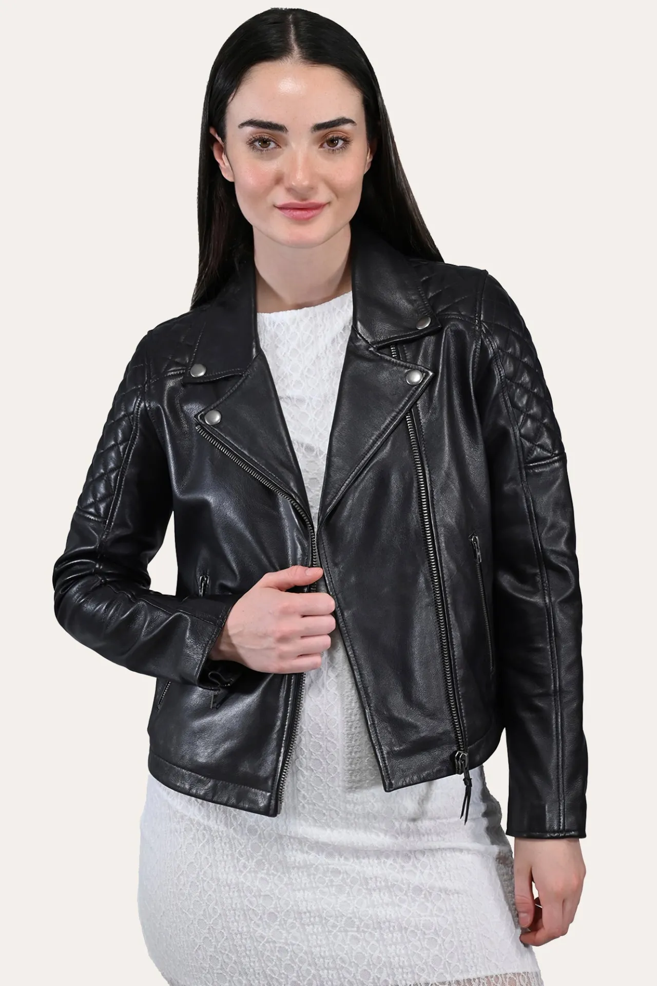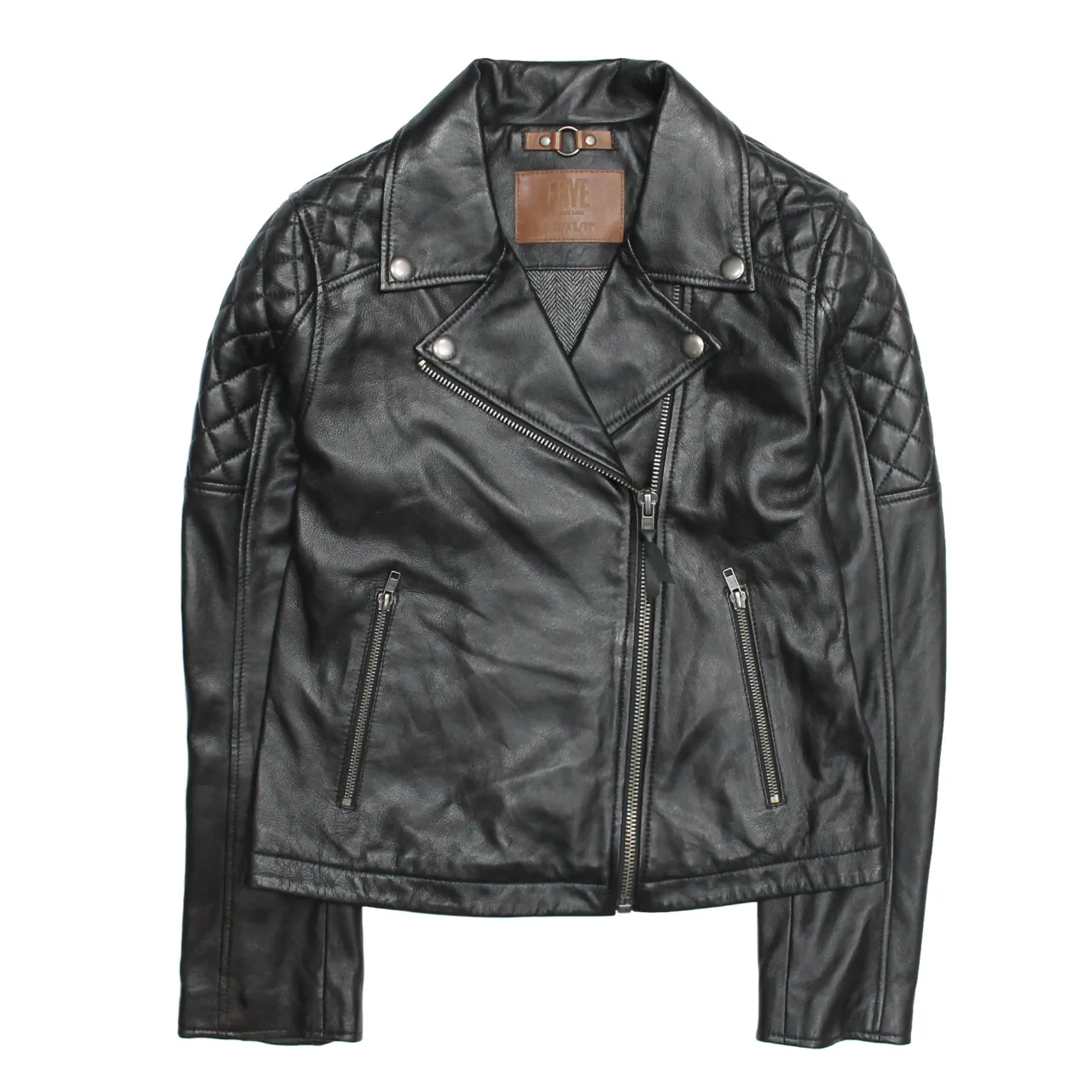 Authentic soft Napa lamb leather biker jacket. This clean & iconic silhouette includes details like an asymmetric front closure, wide lapels, quilted parts on the shoulders and back, and personalized zipper pockets. This is the quintessential and classic #1-selling Frye jacket that should be in every woman’s closet.Material: 100% LeatherCare Instructions: Professional leather care onlyNumber of Pockets: 2Pocket Description: Side PocketsButton Information: Button in the necklaceZipper Information: Zipper closure