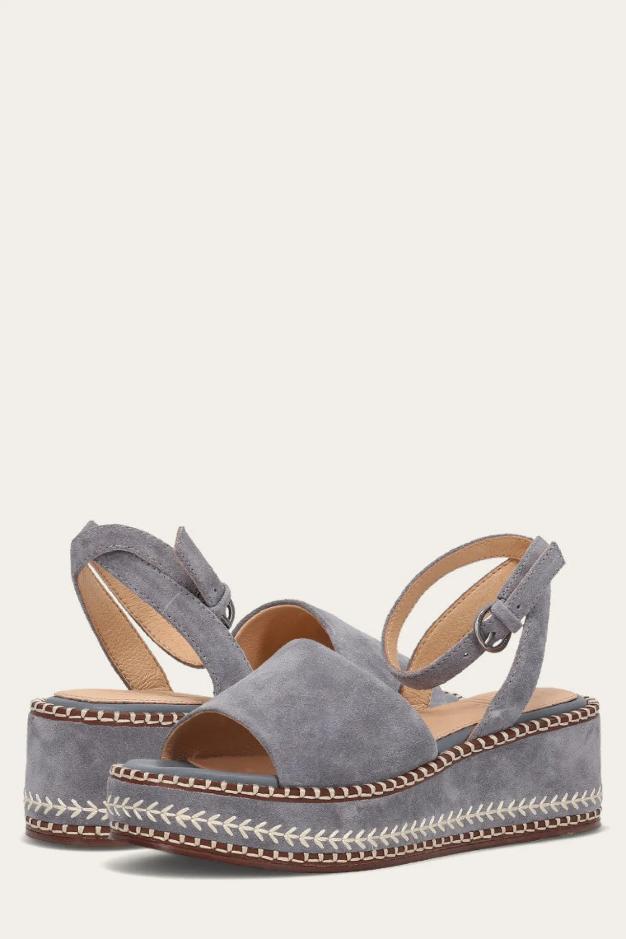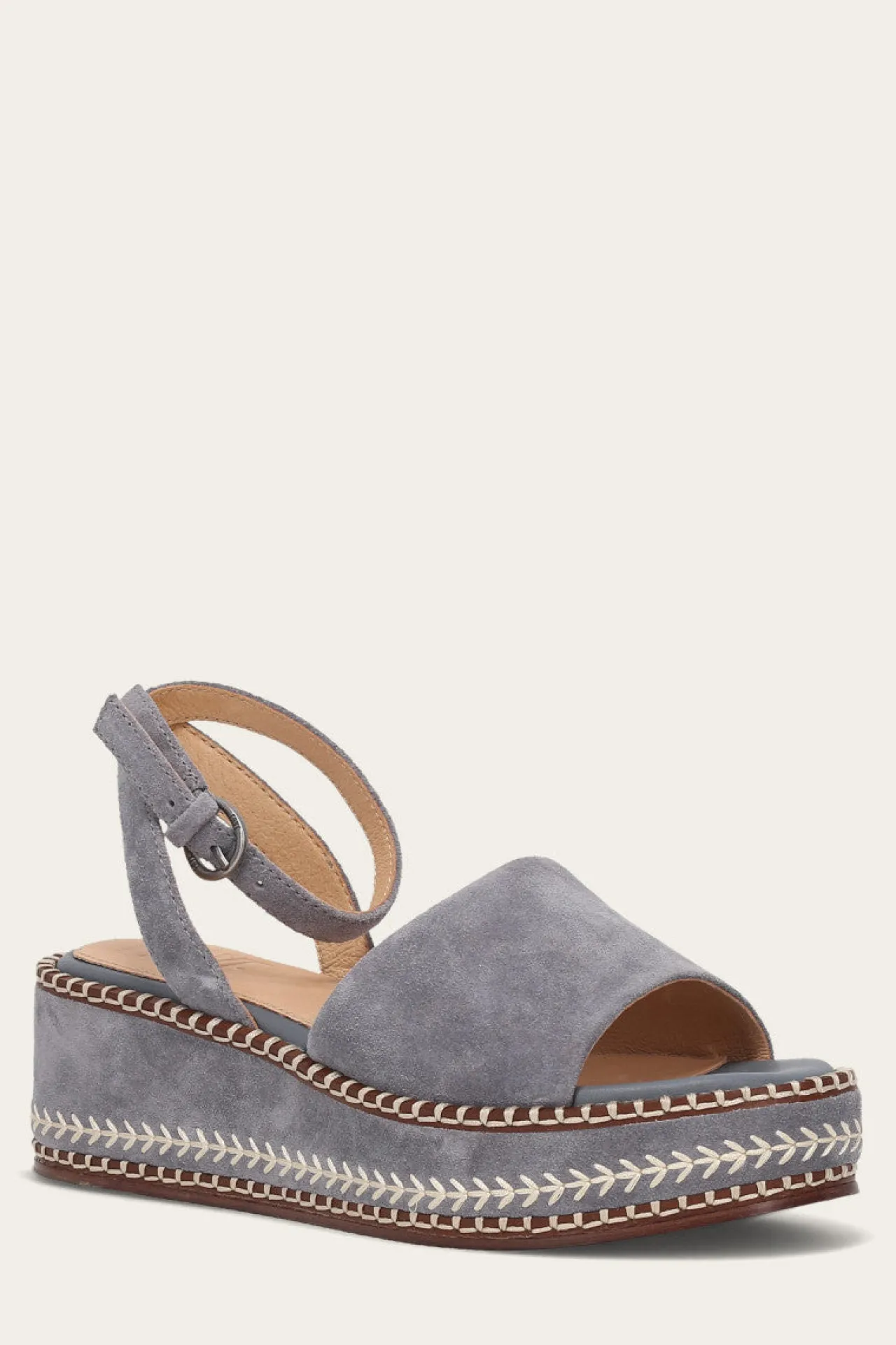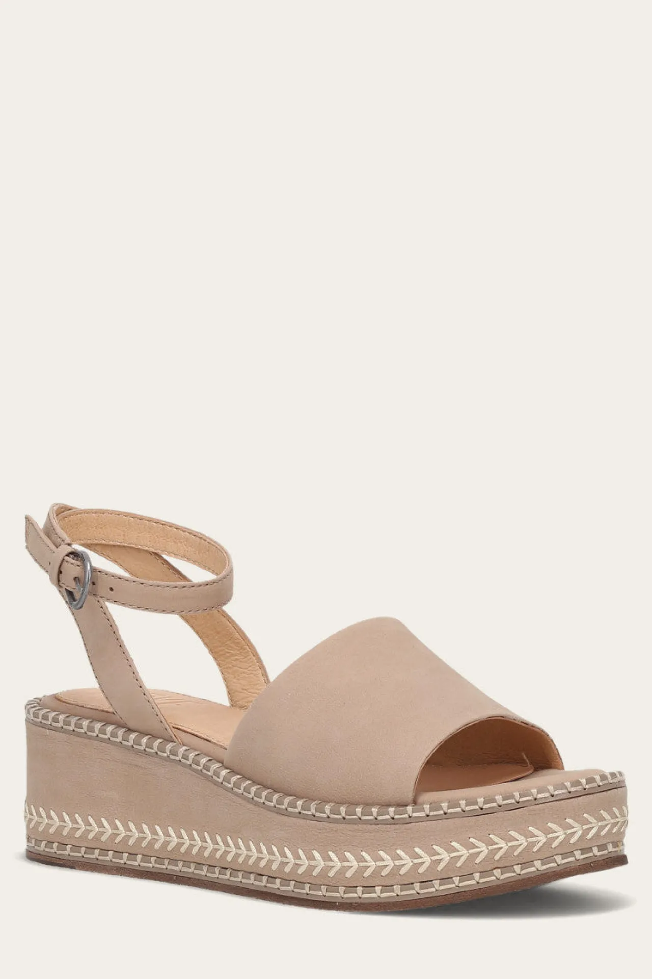 Experience unparalleled style with the Joy Ankle Strap sandal. Crafted from premium nubuck and suede leather, this wedge adds a luxurious touch to this spring silhouette. The new wedge construction, adorned with blanket stitching detail on the welt and decorative arrow stitching on the wedge, reflects the exceptional craftsmanship of the brand. With a 1.375-inch platform height and a 2-inch heel height, it provides just the right amount of height with stability. Featuring an outer buckle closure, this ankle strap offers an adjustable fit.